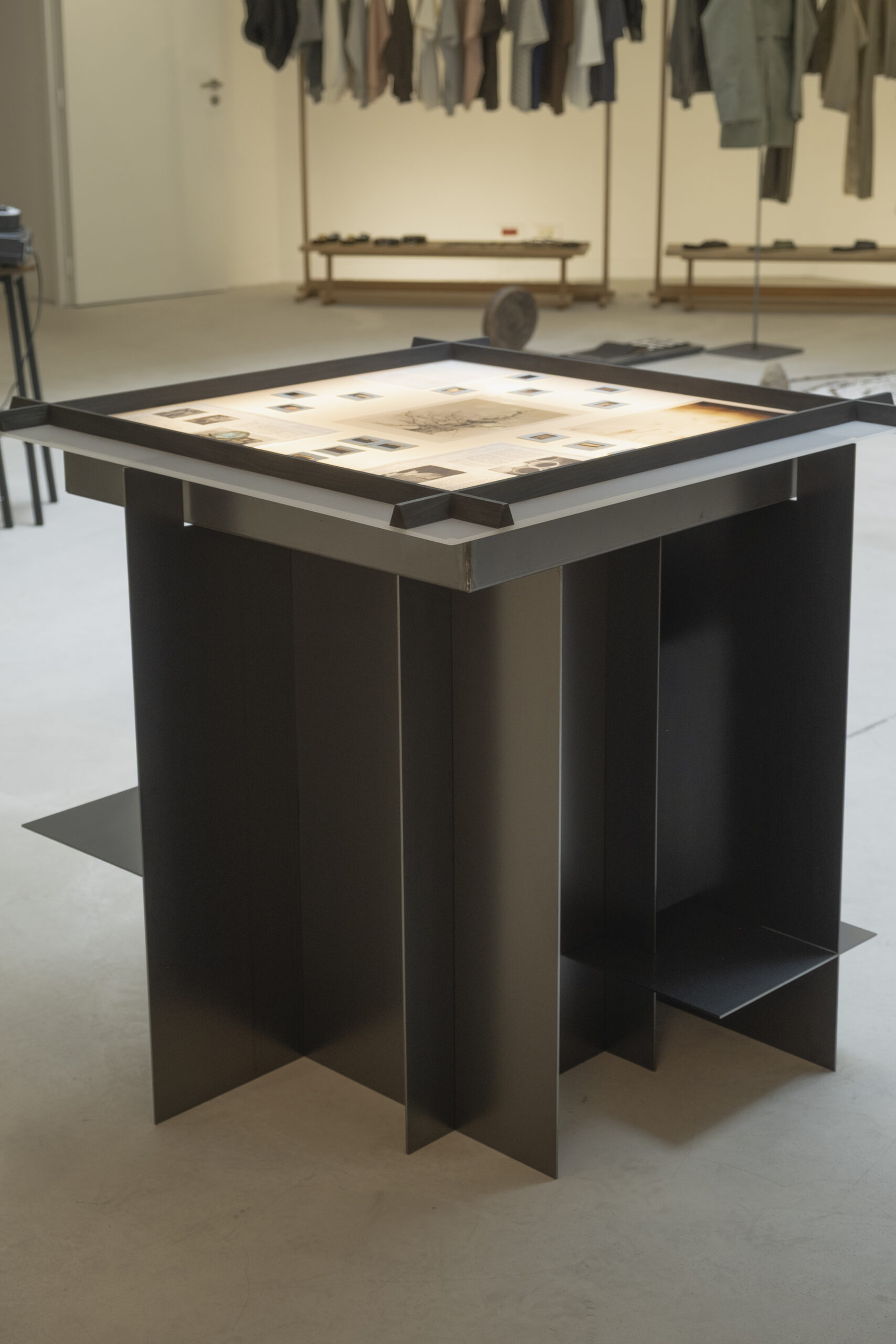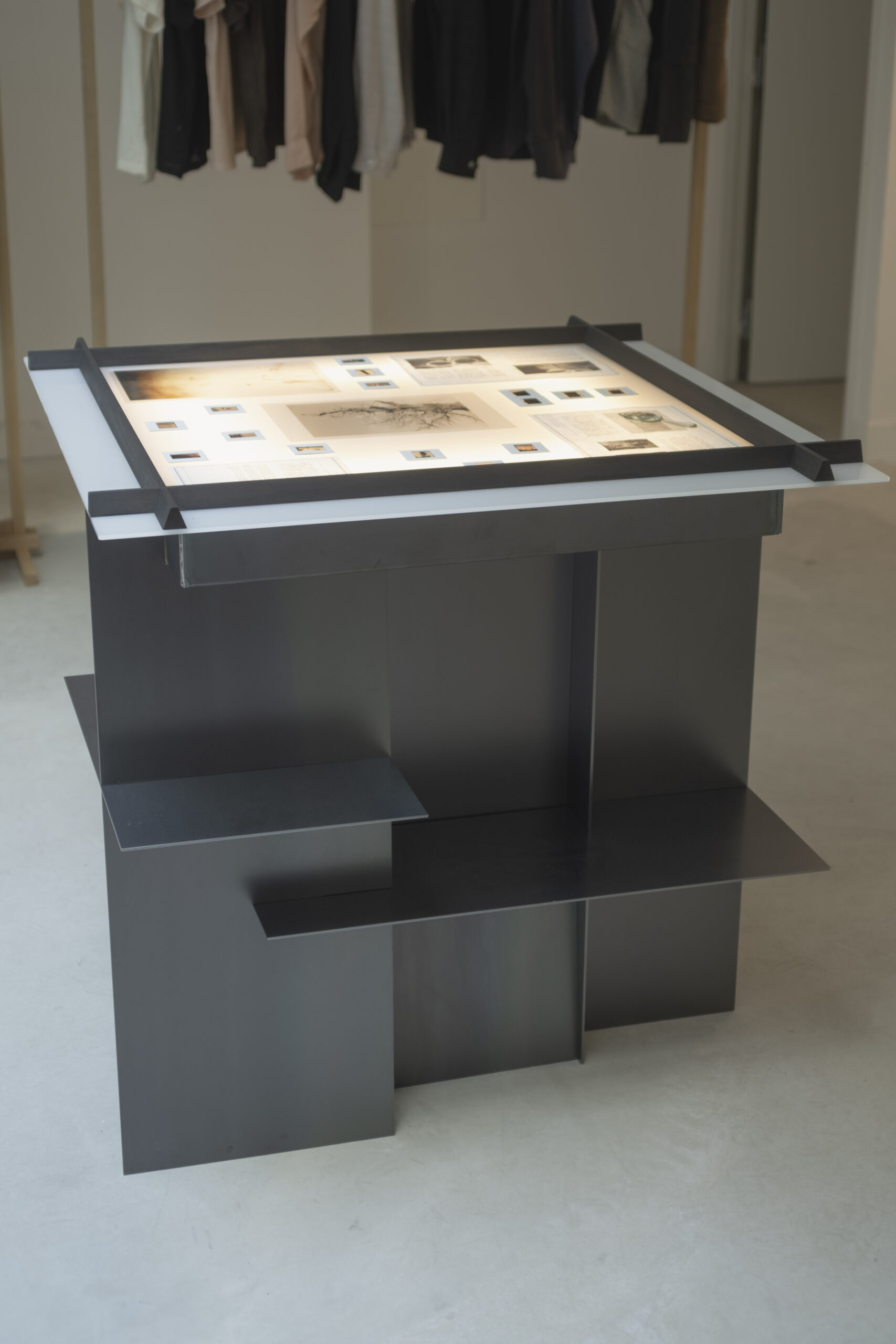 Taiga Takahashiは、 「応用考古学的」 の理念を掲げており、 過去の遺物を甦らせることで未来の考古物を発掘することを目指しています。 そのため、 展示什器には各シーズンのテーマとなる歴史的な書類や記録写真などの資料を展示することが求められました。 それには、 設計図や図版を複製するために発明されたミメオスコープと呼ばれるライトテーブルの形式が最適であると考えました。