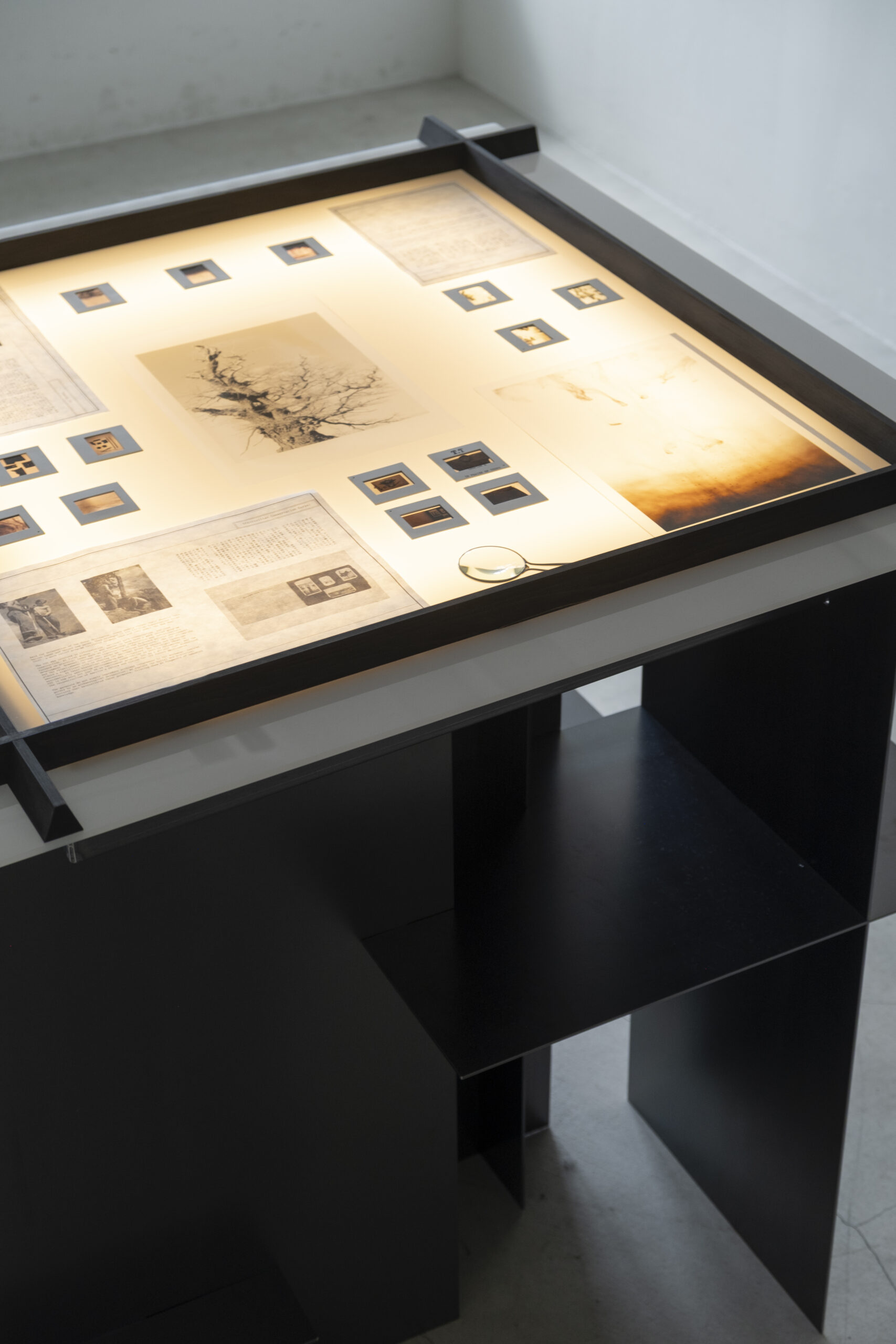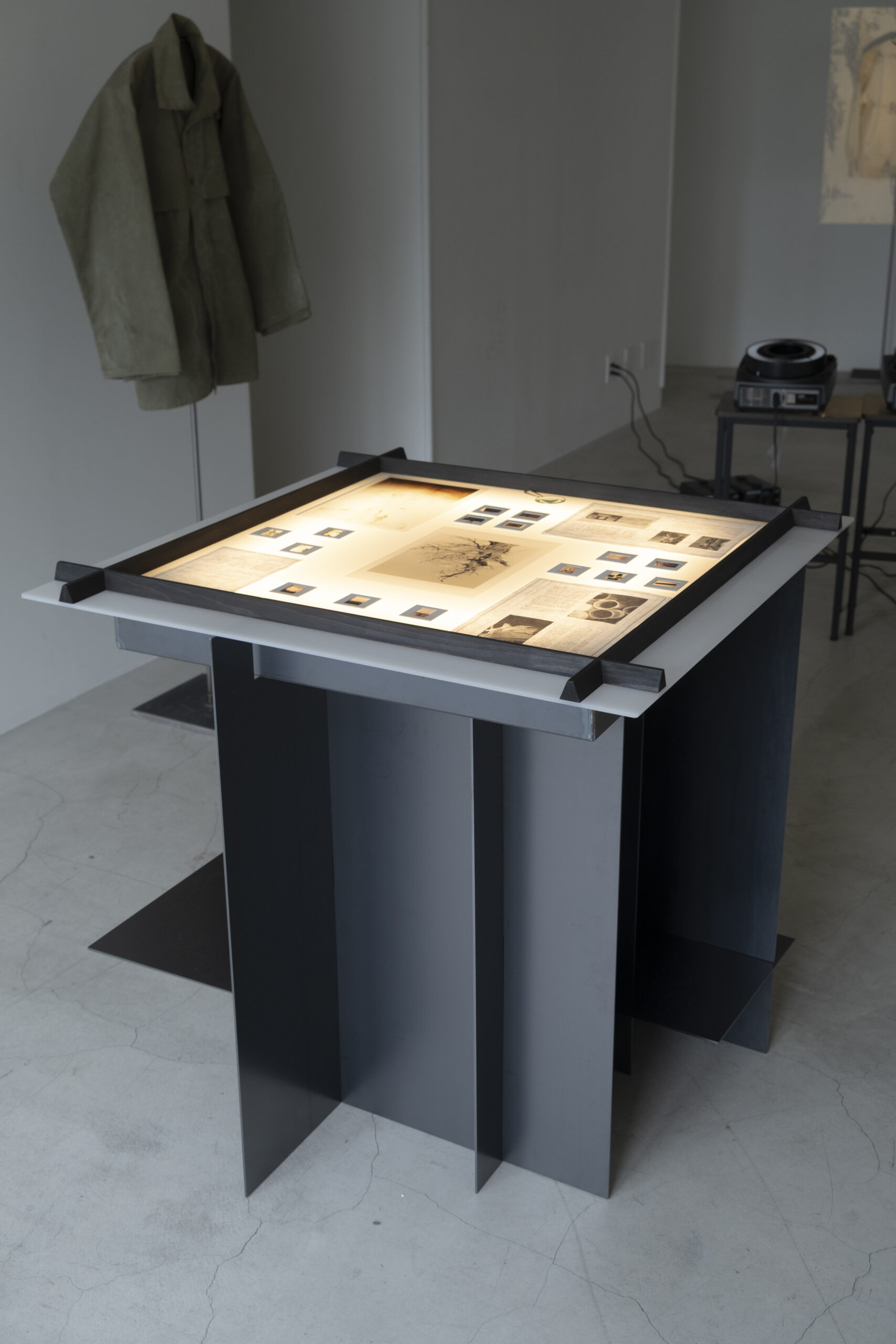 Taiga Takahashi advocates an “applied archaeology” philosophy, aiming to excavate future archaeological artefacts by reviving relics of the past. Consequently, the display fixtures required showcasing historical documents and archival photographs relevant to each season's theme. The mimeoscope—a light table format invented for reproducing blueprints and illustrations—was deemed the optimal solution.