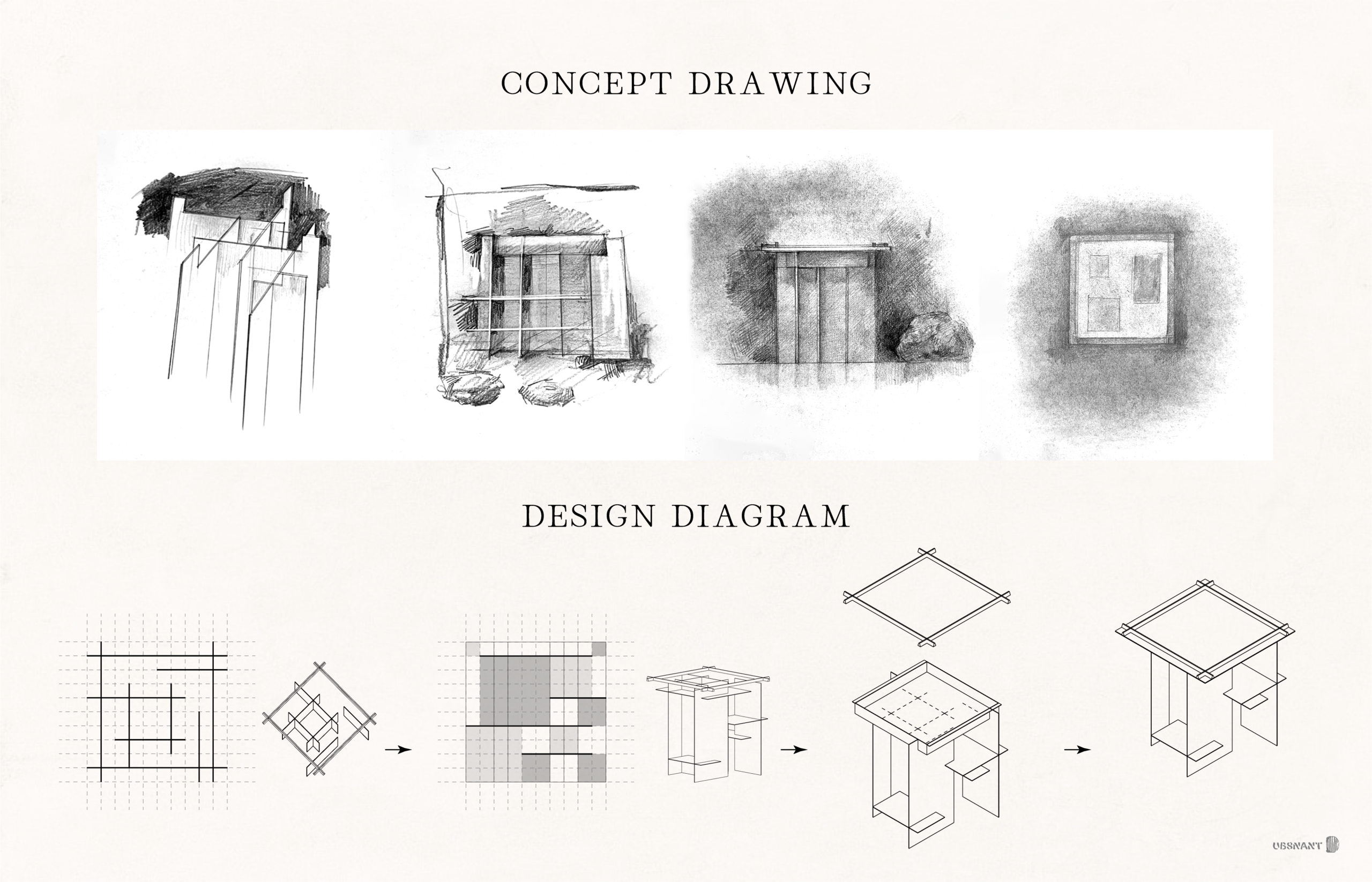 The composition of materials expands the two coexisting structural principles of Kyoto – the order represented by grid-like urban planning and lattices, and the randomness seen in Japanese garden pathways and stepping stones – into a three-dimensional, irregular grid. Referencing the arrangement of broken latticework and stepping stones, elements were positioned to resist fixed patterns, then rhythms of lattices and checkerboard patterns were inserted.
