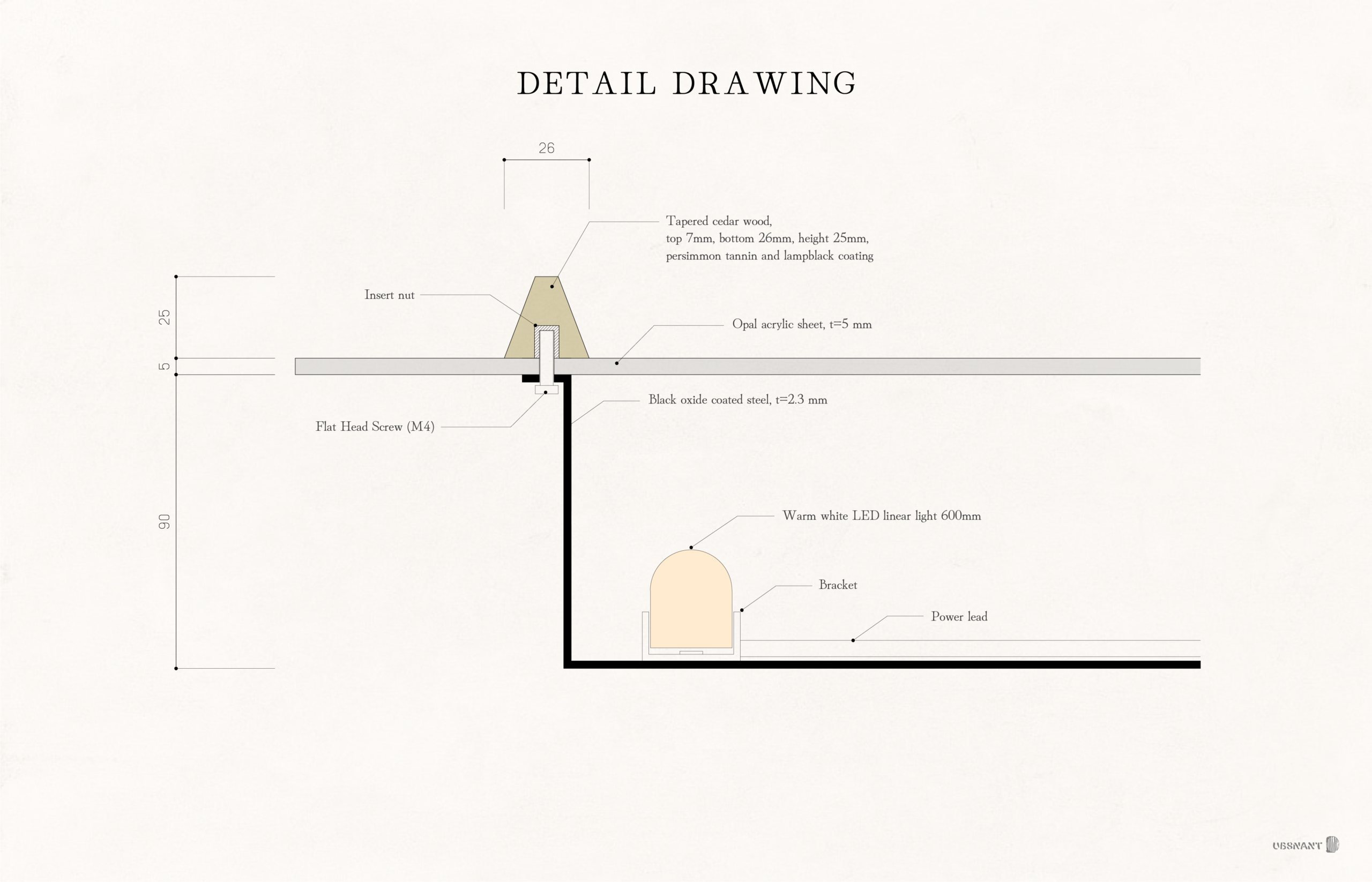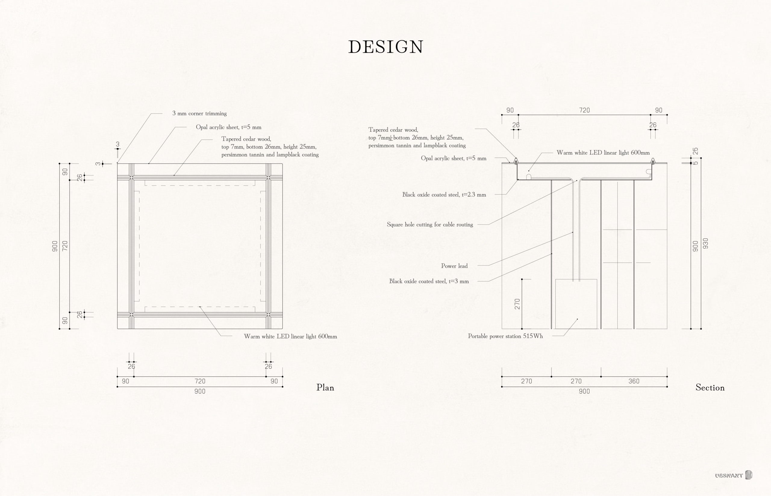 天板は、 端部の見付けが洗練された印象を与えるように、 アクリル板の端部より内側に光源を隠しました。 同じく、 木枠も天板より一回り小さい四角にすることで、 表面に接合が見えずに、 枠・ アクリル板・ スティールの箱、 の3つが固定される納まりとしました。