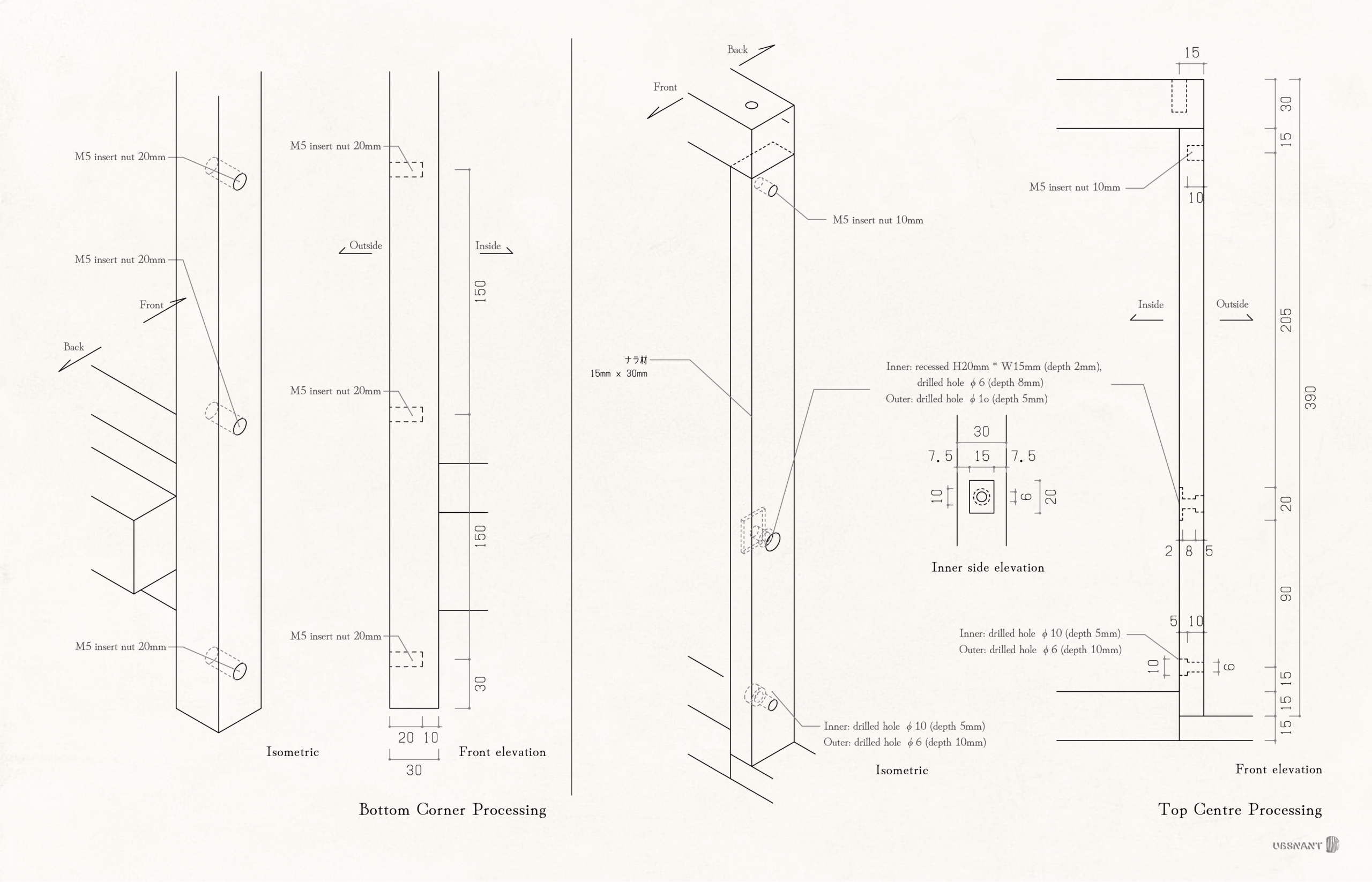 - Japanese oak, brass, tatami, unbleached washi paper, stainless steel, aluminium