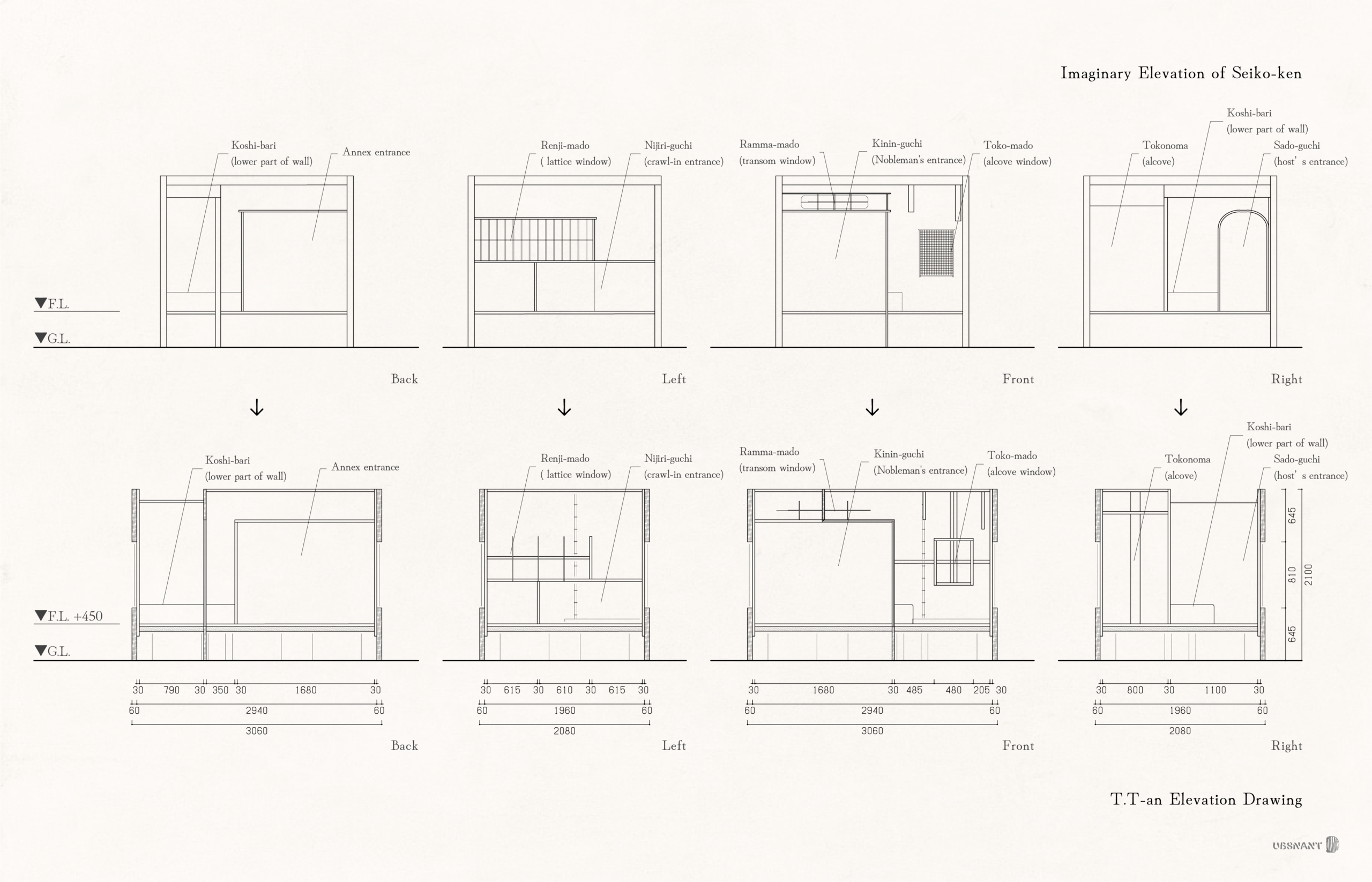 四畳半から三畳へと茶室を現代的に転換していく際に外部空間との繋がりを捨象しないよう、 壁面を持たない茶室を目指しました。 清香軒は独立した建物では無く、 邸宅の一室として作られているため、 まず最初に清香軒を一建築として捉えた想像的な立面図を書き起こし、 デザインが集約された各面の開口部 (貴人口、 躙口、 茶道口、 書院入口、 床窓、 連子窓) と空間の関係性を理解しました。 また、 従来の空間の本質と新たな価値観の共存を図り、 ナラと真鍮という二つの現代的な素材のみで空間を継承することを試みました。